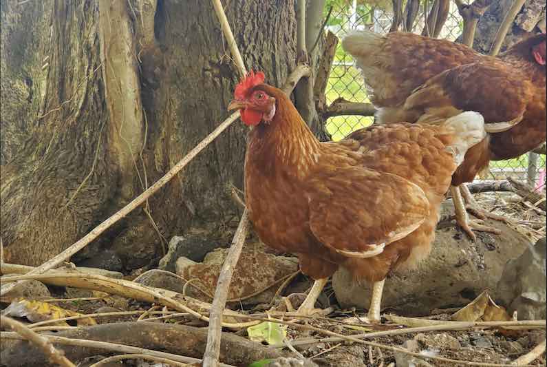 Channon at Golden Farms Oahu in Kahalu'u is raising heritage chickens - Ameraucana (blue and green eggs) and Rhode Island Red chickens (large brown eggs). Heritage breeds are ones that date back before the mid-20th century; they are slow growing, naturally mated, and well adapted to being raised outdoors. Their chickens are raised in a cage-free environment and are raised outdoors on the North Shore.